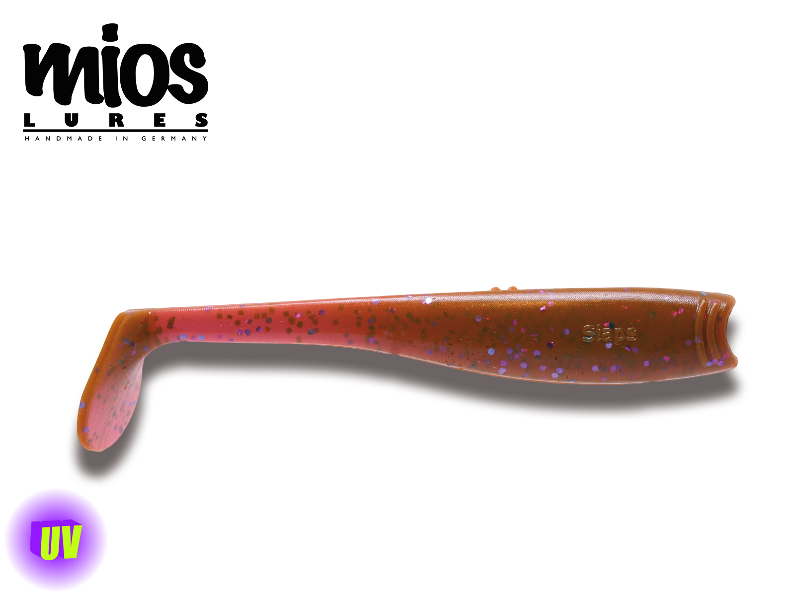 Der MIOS Slaps 12cm ist ein klassischer Schaufelschwanz Gummifisch der durch seine lange Schwanzwurzel und dem 60° senkrecht stehenden großen Tail, besondere Bewegungsmuster und extra starken Druckwellen im Wasser hinterlässt.